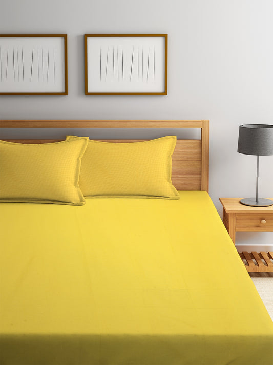 Set of 3 Yellow Color Solid Pattern Cotton Double Bedcover Set, 1 Double Bedcover, with 2 Pillow Cover