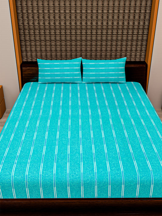 Set of 3 Premium Cotton Stripe Design Mix n Match Pattern Firozi Color Double Bedcover Set, 1 Bedcover, with 2 Pillow Cover