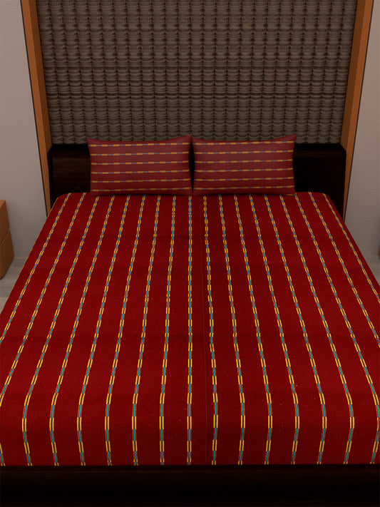 Set of 3 Premium Cotton Stripe Design Mix n Match Pattern Maroon Color Double Bedcover Set, 1 Bedcover, with 2 Pillow Cover