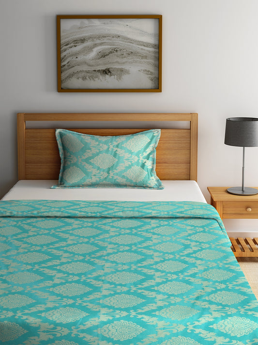 Set of 2 Premium Satin Weaving Turquoise Color Single Bedcover Set, 1 Single Bedcover, with 1 Pillow Cover