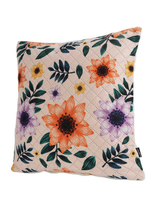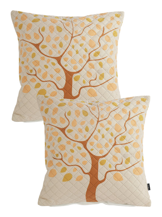 Soumya Beige & Yellow 2 Pieces Floral Printed Quilted Square Velvet Cushion Covers