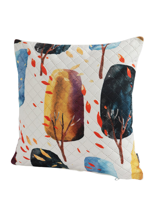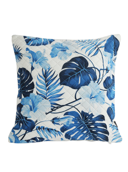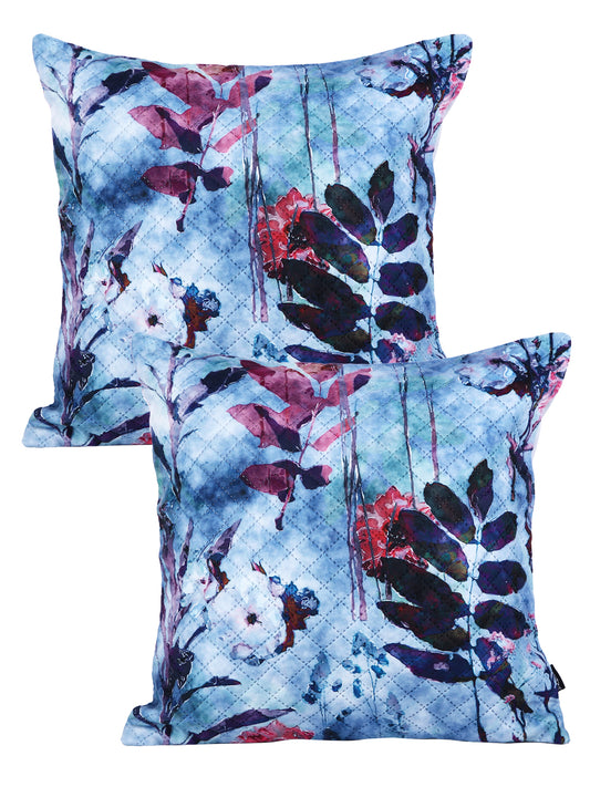 Soumya White & Blue 2 Pieces Floral Printed Quilted Square Velvet Cushion Covers