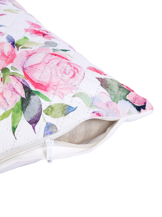 Soumya White & Red 2 Pieces Floral Printed Quilted Square Velvet Cushion Covers