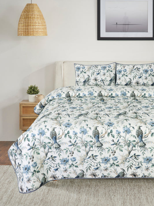 Premium White Color Printed Reversible Quilted Double King Bed Cover Set - 3Pcs