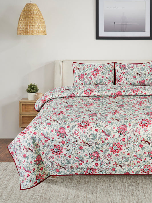 Premium Red Color Floral Printed Reversible Quilted Double King Bed Cover Set - 3Pcs