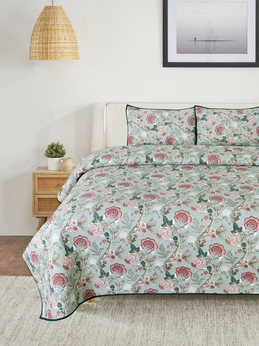 Premium Green Color Printed Reversible 250 to 349 TC Quilted Double King Bed Cover Set - 3Pcs