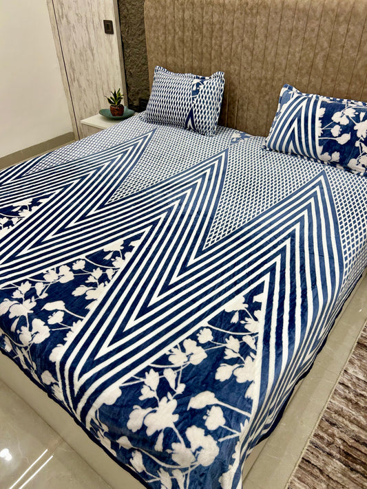 Soumya Blue Geometrical Warm Double Bedsheet with 2 pillow covers