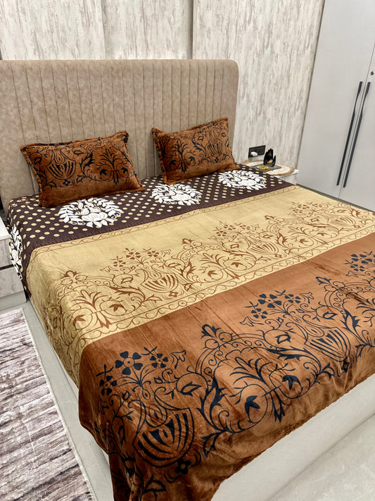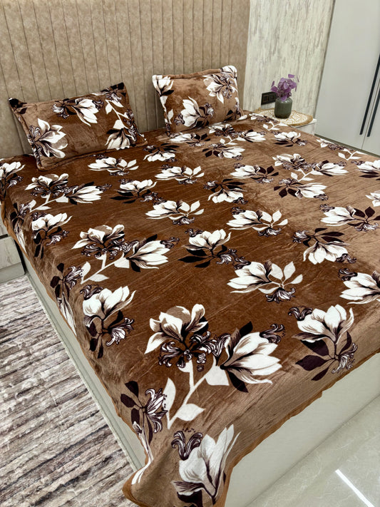 Soumya Brown Floral Warm Double Bedsheet with 2 pillow covers
